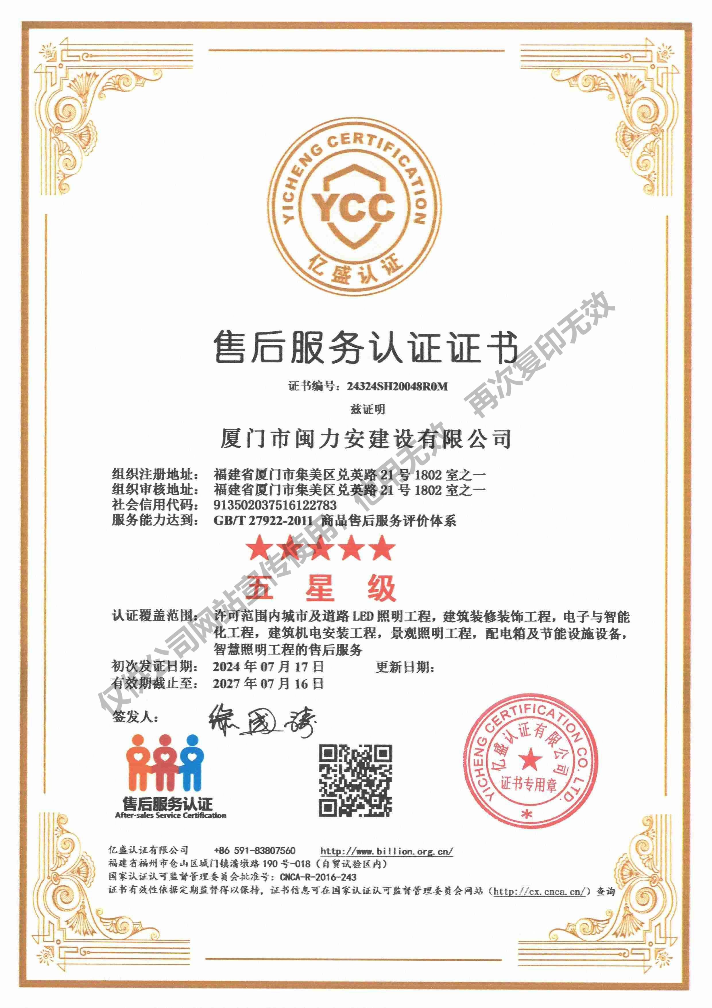 祝賀閩力安取得:售后服務認證證書